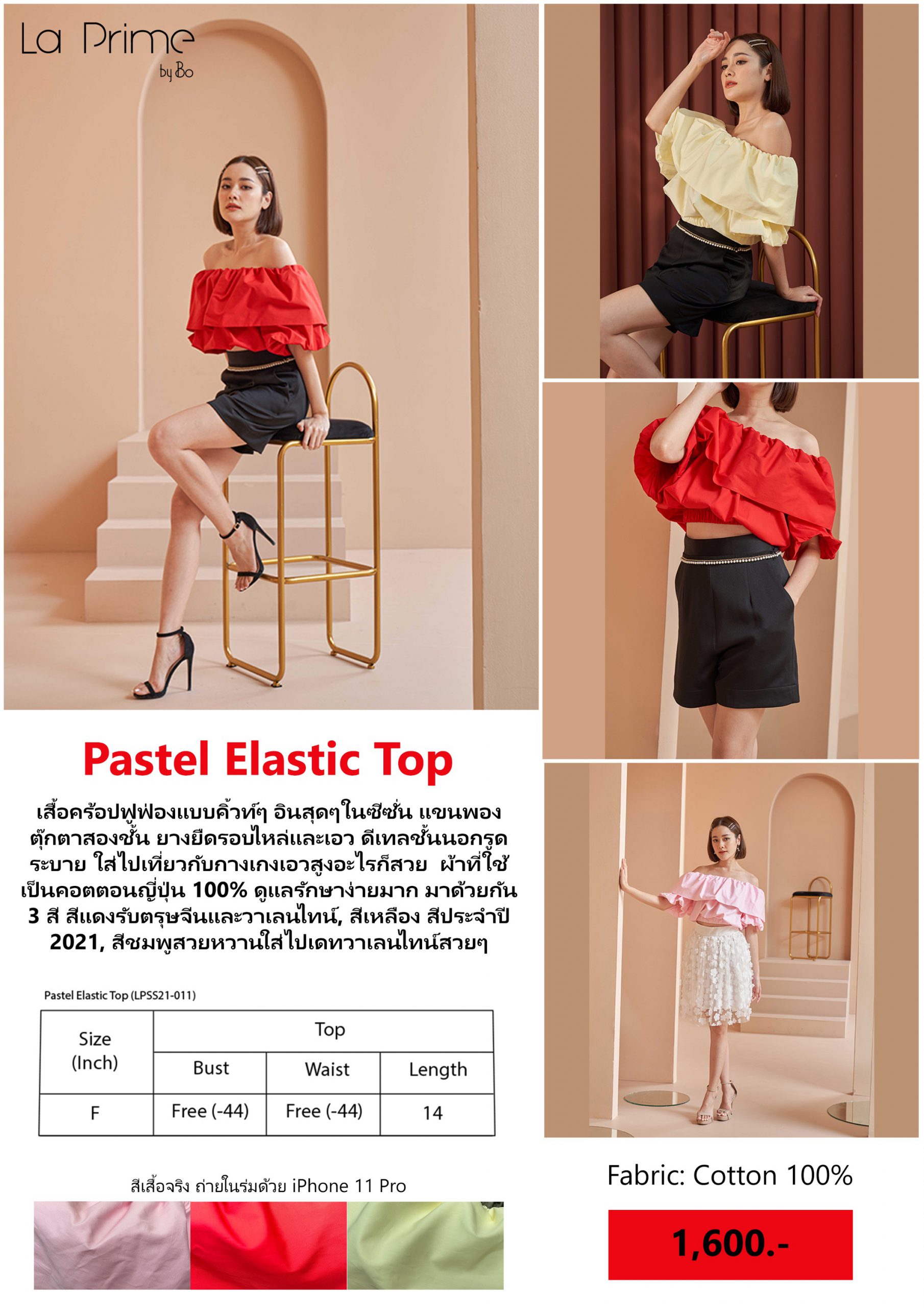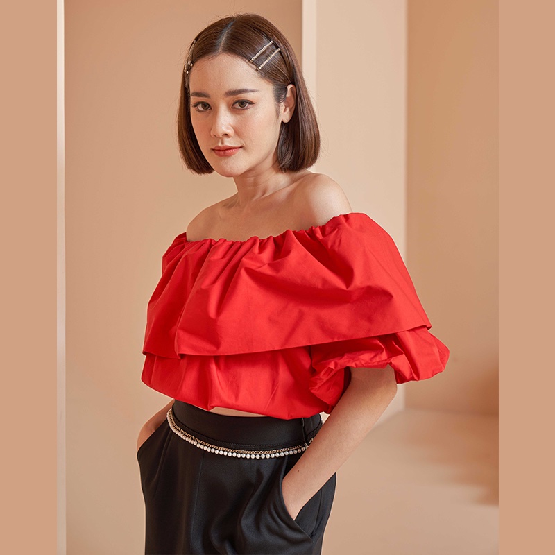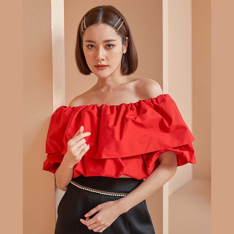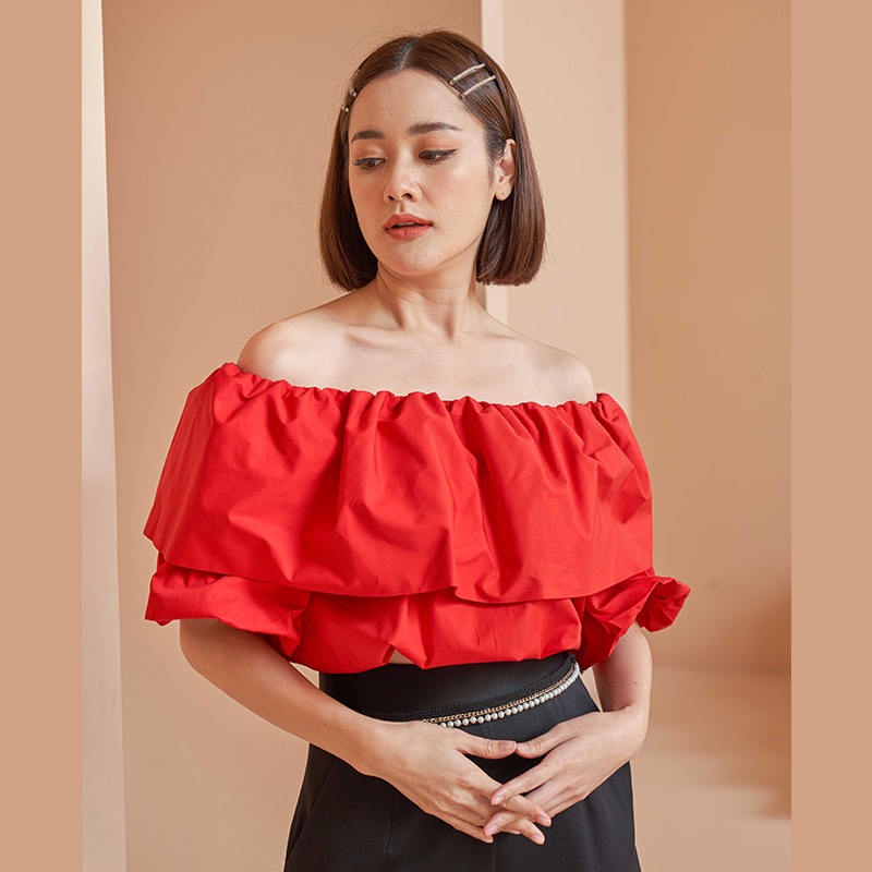 เสื้อคร้อป เปิดไหล่ยางยืด แขนพองตุ๊กตาสองชั้น เอวยางยืด
